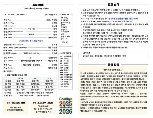 12/28/25 교회 주보 페이지 정보 작성자 아름다운동산교회 댓글 0건 조회 28회 작성일 25-12-27 07:47 목록 본문 12/28/25 다음글12/21/25 교회 주보 25.12.20 댓글 0 댓글목록 등록된 댓글이 없습니다. 목록