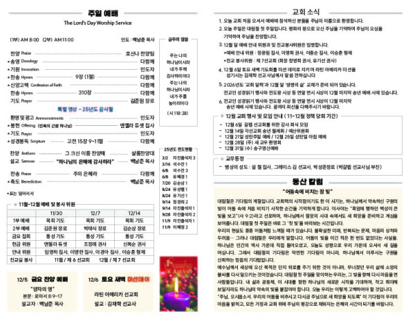 11/30/25 교회 주보 페이지 정보 작성자 아름다운동산교회 댓글 0건 조회 35회 작성일 25-12-06 07:53 목록 본문 11/30/25 이전글11/23/25 교회 주보 25.12.06 다음글11/16/25 교회 주보 25.11.15 댓글 0 댓글목록 등록된 댓글이 없습니다. 목록