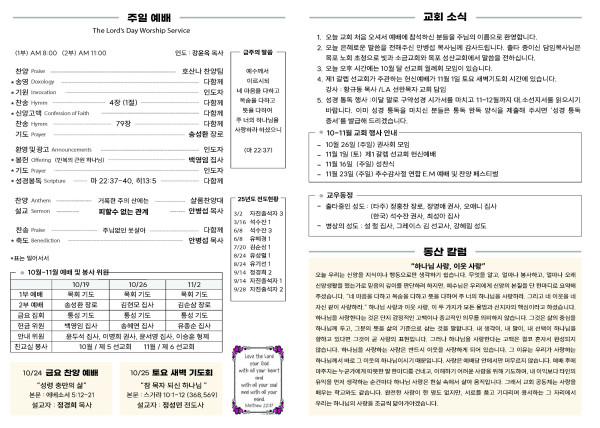 10/19/25 교회 주보 페이지 정보 작성자 아름다운동산교회 댓글 0건 조회 122회 작성일 25-10-25 07:21 목록 본문 10/19/25 교회 주보 이전글10/26/25 교회 주보 25.10.25 다음글10/12/25 교회 주보 25.10.11 댓글 0 댓글목록 등록된 댓글이 없습니다. 목록